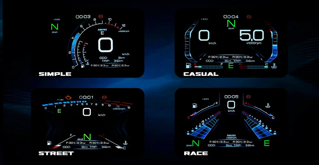 O painel de instrumentos TFT colorido oferece quatro opções de interfaces temáticas, para personalização de uso. Possui dois modos de luz, um de fundo manual e outro de fundo automático e pode ajustar a intensidade da luz de fundo de acordo com o brilho e a escuridão do ambiente, e é convenientemente rápido. Ele também pode monitorar os dados de direção, falhas do veículo, temperatura dos pneus e pressão do ar em tempo real durante a condução para garantir a segurança da direção. Conexão com aplicativo Carbit Ride.